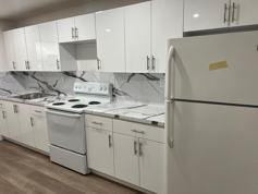 Presenting a recently remodeled one-bedroom, one-bathroom apartment available for immediate move-in. This unit features new flooring, recessed lighting, and fresh paint. The kitchen is equipped with new cabinets and countertops, while the bathroom has been updated with a new vanity, mirror, and shower tile.