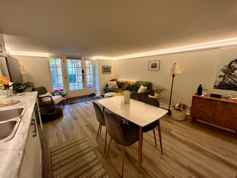 Step through french doors into an open-concept living and dining area with brand-new finishes, a kitchen equipped with stainless steel appliances, plenty of storage, and a dishwasher. Both bedrooms provide comfortable layouts with room for a bed, dresser, or home office setup. The bathroom is a standout, featuring in-floor radiant heating, a tiled tub/shower combination, and a modern vanity.