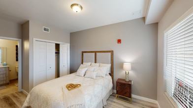 All units have full-size washer and dryer, modern cabinets in the kitchen and bathrooms, luxury vinyl tile through-out the unit, balcony/patio, built-in shelving in the kitchen, living room and bathroom, and new black kitchen appliances, including a built-in range hood microwave.