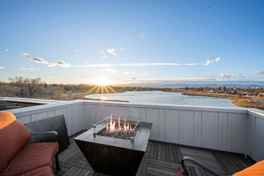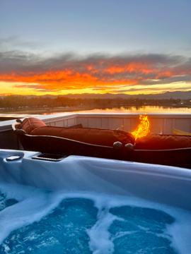 Rooftop patio: hot tub, grill, smart TV, fire pit, and panoramic sunrise/sunset views.