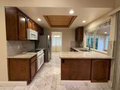 The home also offers a spacious living room and a dining area adjacent to the kitchen. For your convenience, a washer and dryer are provided in the garage. Additional amenities include a two-car garage with an automatic opener, a beautifully landscaped low-maintenance patio offers a bountiful mandarin tree, and central air conditioning and heating.