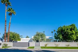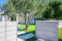 Modern designer home with mountain views! Fully renovated and reimagined contemporary home with panoramic mountain views in desirable Palm Springs. This modern residence features 3 bedrooms, 2.5 baths, and exceptional attention to detail throughout. The entry showcases a stunning full-glass door, leading to an expansive living room with vaulted wooden slat ceilings and skylights that fill the space with natural light. The gourmet kitchen includes black stainless-steel appliances, quartz countertops, open shelving, and a breakfast bar, flowing into a dining area and den-ideal for everyday living and entertaining. The primary ensuite offers a spa-like bath with a soaking tub, walk-in shower, and custom closet system. Guest bedroom also features extra-deep closets with built-ins, and the third bedroom could pull double duty as an office or guest space with a daybed, wardrobe, and desk. Enjoy resort-style outdoor living with mountain views, artificial turf, a saltwater lap pool, above-ground spa, and a covered cabana with outdoor lounge and dining areas. An attached two-car garage with mini-split AC provides flexible use for fitness or workspace. The property is fully fenced with an electronic sliding gate, shaded front yard, and mature plants and trees. Offered fully furnished. Available now for a 12-month lease.