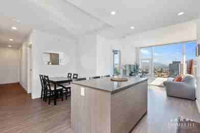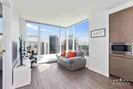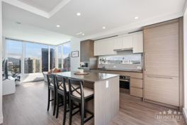 This desirable West & South corner 2-bedroom suite is designed for style and function: open-concept kitchen-dining area, expansive floor-to-ceiling windows and a sizable balcony boasting panoramic city views. The kitchen is outfitted with integrated Blomberg & Fulgor Milano appliances, elegant quartz countertops and a functional kitchen island — perfect for entertaining or everyday living. Lease terms apply: 1-year minimum, renters insurance required, no smoking, credit & income verification required.