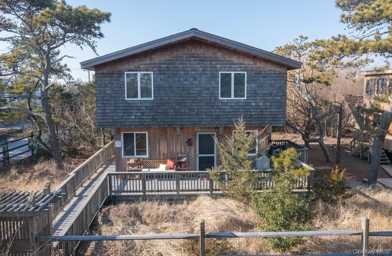This spacious 5-bedroom, 2-full-bath home is fully winterized for year-round enjoyment. Ideally located just minutes from the shops, restaurants, and nightlife of downtown Ocean Beach, it offers the perfect balance of convenience and tranquility. The second floor features an open-concept layout, complete with a modern kitchen with island seating, a dining area, and a living room with vaulted ceilings throughout—creating a bright and airy coastal vibe. Step outside to expansive front and back decks, perfect for entertaining guests or simply unwinding in the peaceful surroundings.