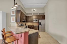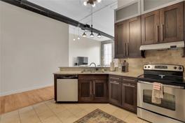 The guest-ready kitchen has modern stainless appliances, plenty of storage space, a wine cooler, and a built in laundry room just beyond the hall bath. The kitchen is adjoined by a large living area with built-in shelving, ample lighting, and soaring ceilings!