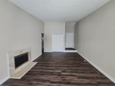 The spacious living room is filled with natural light, adorned with new wood plank flooring, and includes a cozy fireplace, creating a perfect ambiance for relaxing or hosting guests.