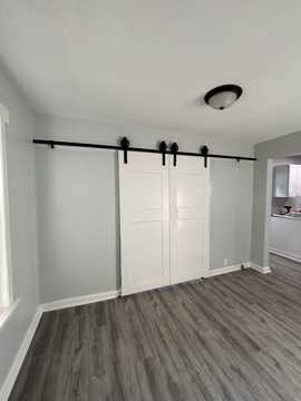 Beautifully updated one-bedroom upper unit featuring stylish barn-style doors separate the bedroom from the living room, creating a comfortable and functional layout. The kitchen includes white shaker cabinets with modern fixtures and railings, offering a fresh, contemporary look. Vinyl plank flooring throughout makes cleaning easy and is robot vacuum–friendly. New washer and dryer conveniently located in-unit. Property managed by Key Realty Delta County Contact: Melissa Schuster (906) 399-8182