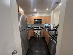 The kitchen includes high-end appliances, quartz countertops, and ample cabinet space. Both bedrooms are generously sized, including a primary suite with a large walk-in closet and private bath. In-unit laundry adds everyday convenience.