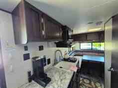 Includes queen bed and dinette nook with table and bench seating. The kitchenette has a small fridge, 2-burner gas stove, a microwave, and a small Kureg coffee maker. Includes cooking and serving utensils, coffee mugs, and glasses.