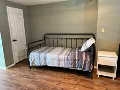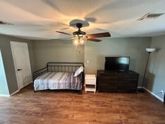 This unit is one of the large upstairs bedrooms. Fully furnished, with all utilities included in the monthly rent. Twin bed, couch with a pullout bed, and TV are in the bedroom.