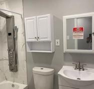 The bathroom provides a true spa-like experience with elegant marble-look tilework and a premium rain shower panel system complete with body jets for ultimate relaxation.