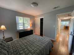Clean, comfortable room in a welcoming 4BR/2.5BA home. Unit D is one of three non-master bedrooms sharing a hall bath (with tub/shower) with Units B and C. The 10' × 11' room includes a full-size bed with a deep mattress, chest of drawers, and closet—ready for easy move-in.