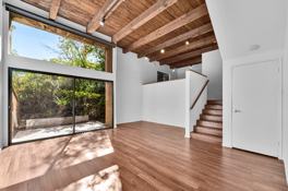 A rare mid-century townhome-style apartment in the heart of Los Feliz, this split-level home blends thoughtful design with everyday comfort. The living room rests beneath vaulted open-beam ceilings and tall windows that fill the space with natural light. Just above, the dining area overlooks the living room, creating depth and an architectural flow that's hard to find in a rental.