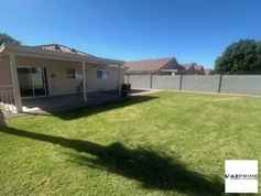 The backyard is a true highlightfeaturing a covered patio, lush green grass, and plenty of room for kids to play and enjoy.