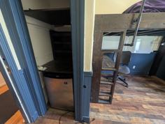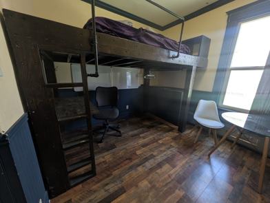 This is room #28, a quiet, medium-small room with a standard closet, sturdy built in full sized loft bed platform & mattress, and fold down desk with chair. Includes linens, mini fridge, mirror, window coverings, and large additional storage shelf above the door. The window faces the interior courtyard.