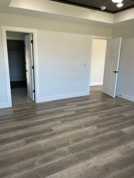 The modern kitchen comes fully equipped with stainless steel appliances, including a glass-top stove, microwave, dishwasher, and refrigerator. Vinyl flooring throughout ensures easy upkeep, while the primary bathroom with double sinks adds an extra touch of convenience.