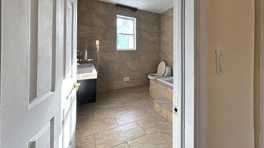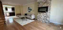 This Philadelphia residence offers a blend of compact living and modern amenities across two floors. The home features 2 bedrooms, including a primary bedroom and 1 bathroom. The ground floor showcases a spacious living area with gleaming hardwood floors and large windows that flood the space with natural light. A standout feature is the accent wall adorned with textured stone, adding visual interest to the room. The kitchen, while not fully visible, appears to have updated appliances and countertops. The bathroom has been renovated with large-format tiles, a modern vanity, and a combination tub-shower. Upstairs, there are the bedrooms, which continue the hardwood flooring theme. Throughout the home, neutral wall colors and white trim create a fresh, contemporary ambiance. The property's layout maximizes the available space, offering a comfortable living environment in an urban setting.