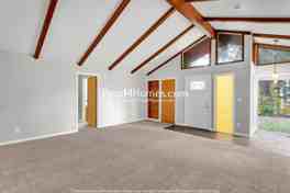 -Expansive single-level layout with large living room, exposed wood beam ceilings, and a beautiful stone fireplace