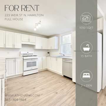 223 Weir St N #1, Hamilton, ON is a 3 bedroom, 2 bathrooms apartment for rent. It is located in the Homeside neighborhood of Hamilton. It has apartment amenities including dishwasher, central heat, ceiling fan, air conditioning, and in-unit laundry. Cats and dogs are allowed, making it a pet-friendly apartment.