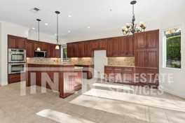 Enjoy a chef’s kitchen complete with a dining bar, double ovens, built-in microwave, and generous counter and cabinet space. The adjoining dining area overlooks the fenced backyard with a large patio — perfect for entertaining or relaxing outdoors.