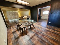Open layout offers extra large living room, nice dining area, fully equipped kitchen with generous cabinets/drawers, laundry room with washer/dryer. Furnishings include large comfy sectional, coffee table, side buffet tables, dining table and chairs, 3 queen beds with mattresses, side tables.