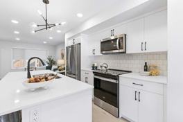 4. Kitchen with full stainless steel appliance package: French door fridge, electric range, built-in microwave, and dishwasher.