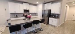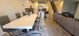 Key features include an open-concept kitchen with white cabinetry and stainless steel appliances, complemented by a large kitchen island. The cozy living room is filled with natural light and overhead fans for added comfort. Enjoy evenings in the well-maintained backyard featuring a covered patio. The master suite offers a luxurious bathroom with dual sinks and a stylish glass-enclosed shower. Residents will also appreciate a community pool and shared outdoor space.