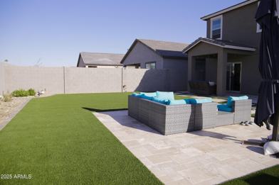 Built in 2024, this stunning two-story home showcases an open kitchen that seamlessly connects to the family room and opens to a covered patio, perfect for indoor-outdoor living. The backyard is fully fenced with durable block walls and features low-maintenance artificial turf and pavers. Inside, enjoy a first-floor bedroom, a generous loft, walk-in closets in four bedrooms, and a convenient laundry room on the second floor. The home also includes dual-zone A/C, a programmable thermostat, and a two-car garage for added comfort and functionality. thermostat. A two-car garage completes this impressive home.