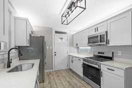 This beautifully renovated property blends modern elegance with classic charm, featuring three bedrooms and two full baths. The brand new white shaker kitchen includes quartz countertops, cabinet lighting, stainless appliances, refrigerator w/ice and water on door, dishwasher, stove with air fryer oven feature and a built-in microwave. Downstairs, original hardwood floors are refinished, upstairs, luxury vinyl plank floors offer comfort. The vintage bathroom retains its deep soaking tub, complemented by a new toilet and vanity. The second floor has a new full bathroom with vaulted ceilings and 2 spacious bedrooms with ample closets. The first floor includes a third bedroom and a separate dining room.