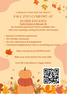 Looking for your next home in Warsaw? Don’t wait — only a few apartments remain at Kuder Estates! ✨ 2-Bedroom Apartment Homes ✨ Peaceful, pet-friendly community ✨ On-site management & maintenance ✨ Close to shopping, dining, and major employers We have 1 apartment ready now and 3 more coming available by November 14th — Pre-lease today to secure your spot before they’re gone! 💰 Rents starting at $1,029/month 📍 Kuder Estates – Warsaw, Indiana Your new home is waiting — move in before the holidays and stay cozy all winter long! ❄