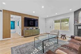 An open floor plan anchors the home, highlighted by smooth-coat walls + ceilings, updated windows, wide-plank flooring, and recessed lighting. The living room centers around a striking black brick fireplace and custom wood-slat media wall. Large sliding doors blur the line between indoors and out, opening to an oversized covered patio—your new lounge, dining deck, and year-round hangout. A second patio/side yard adds extra space for grilling, dinning and storage.