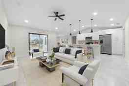 Welcome to this stunning new construction home, thoughtfully designed for modern living and flexibility. Featuring 3 bedrooms + den, 2 bathrooms. This home showcases an open-concept layout with high ceilings, spacious living and dining areas, and large windows that fill the space with natural light. The gourmet kitchen features quartz countertops, stainless steel appliances, and custom cabinetry. The Master bedroom offers a spa-like ensuite bathroom with glass shower doors, a double vanity, and two walk-in closets. Additional features include impact-resistant windows and doors, blinds installed on all windows for privacy and comfort, a paver driveway, a washer and dryer, and an outdoor kitchen.
