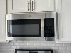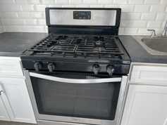 Full new size stainless steel refrigerator, gas stove, built in microwave.