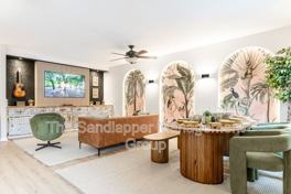 Property Features: The residence features a stunning open-concept design with exposed wooden ceiling beams and designer lighting throughout. The main living area showcases custom botanical wallpaper with illuminated arched alcoves, creating a unique and sophisticated atmosphere. Premium leather furnishings and contemporary decor complement the home's modern aesthetic. The entertainment center includes a large flat-screen television with integrated sound system for both relaxation and entertainment needs.