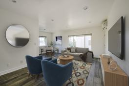Carefully restored and designed by a renowned LA designer, these 1960s modern luxury rental homes feature keyless entry door locks to spacious one and two-bedroom floor plans with newly renovated kitchen and bathrooms. The kitchen boasts sparkling white stone quartz countertops with brand new self-closing cabinetry and high-end stainless-steel refrigerators with matching gas cooktop with oven and microwave. iRing doorbells with a smart home video security camera are also included. There's a community washer and dryer on site. Bathrooms feature porcelain tiled bath tubs and glass shower doors. Each rental home also includes central A/C cooling and heating with recessed lights with luxury style cellular shade window blinds and distressed wood plank floors.