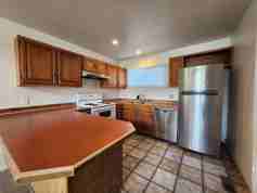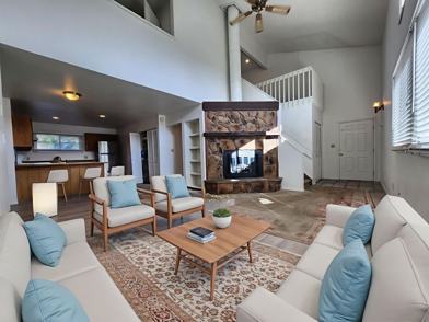 This spacious two-level condo offers a comfortable and well-maintained living environment, ideal for residents seeking both affordability and room to spread out. Located in a quiet end unit with no one above you, the home features a functional layout with the master bedroom and full bath conveniently located downstairs, and two additional bedrooms upstairs with a dual vanity bathroom and washer & dryer hookups. Enjoy a modern aesthetic throughout, including a breakfast bar, large windows that bring in tons of natural sunlight, carpets, neutral paint tones, and ample closet/storage space. The living room is perfect for relaxing with a cozy wood-burning fireplace—great for snowy days or a peaceful evening in. Vaulted ceilings and central air conditioning, along with ceiling fans, help keep the space cool and comfortable year-round.