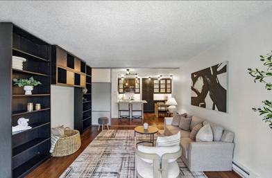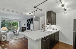 This open-concept one-bedroom home features a remodeled kitchen and bathroom with quartz countertops, shaker-style cabinetry, and elegant Sapele Mahogany hardwood floors throughout. The bright and functional layout provides both comfort and style, perfect for todays modern lifestyle.