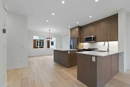 On the second level, you'll find a beautifully appointed kitchen with full-height cabinetry, elegant quartz countertops, premium stainless steel appliances, and a large island for extra prep and seating. Soft-close cabinets and drawers add a high-end touch, while the bright dining area and road-facing balcony create an inviting space for everyday living and entertaining. A convenient two-piece powder room completes this floor.