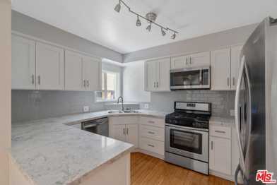 Welcome to the Los Feliz Capri, a small and charming mid century condo complex! Enter through a mature garden of succulents towards this peaceful ground floor unit at the rear of the building. Inside, find a spacious living room leading to the dining area and the recently remodeled kitchen featuring quartz countertops, white cabinetry, and stainless appliances. The adjacent balcony provides a spot for relaxing or dining outdoors. The central hall has a bonus area perfect for a work from home setup along with the linen closet. The two bright and generously sized bedrooms each feature a wall of closets for plenty of storage space and the modern bathroom has a tub as well as separate stand alone shower. Custom shutters throughout provide privacy + light control and the mini split HVAC units in each room provide quiet and efficient heating and cooling. There is one covered parking space with adjoining storage cabinets in the carport and the community laundry room is conveniently close to the unit. Superb location in central Los Feliz just a few blocks from Griffith Park and countless stores and restaurants on Vermont and Hillhurst Aves - Maru Coffee, Blue Bottle, LIttle Dom's, Mirate, Alcove, Albertsons, Los Feliz 3 Cinema, Skylight Books + so much more. Available for immediate occupancy!