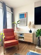 LIVING ROOM: Includes a very comfortable sectional sofa, 2 accent chairs, and a 75” smart TV.