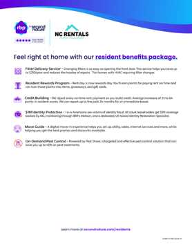 En NC Rentals 247 ofrecemos beneficios adicionales diseñados para hacer la renta más fácil, accesible y conveniente. Todos los nuevos contratos incluye nuestro Paquete de Beneficios para Residentes (RBP), un programa mensual obligatorio que permite a los inquilinos construir historial de crédito mediante pagos puntuales de renta, acceder a recompensas por renta y que también incluye control de plagas, asistencia para la activación de servicios y protección de identidad. Adicionalmente, los solicitantes que califiquen pueden tener la opción de mudarse sin pagar un depósito de seguridad tradicional, ayudando a reducir los costos iniciales. Esta opción es opcional y está sujeta a aprobación.