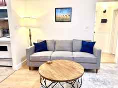 You'll find starter toiletries, a vacuum, dustpan/brush, paper products, towels, washcloths, starter laundry & dish detergent, hair dryer, iron and ironing board, Roku TV, white noise machine, countertop dishwasher, all-in-one washer/dryer, Keurig, small but full kitchen, lamp w/ USB ports, and nightstand with outlets and USB ports on the top shelf.