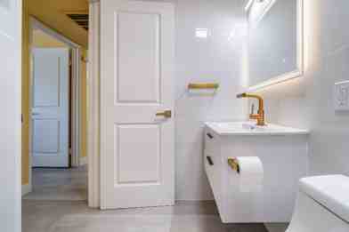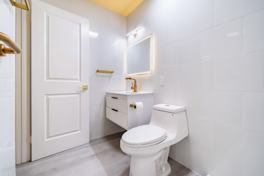 All fixtures and hardware throughout the unit are finished in a striking gold