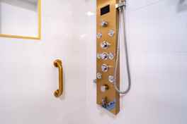 The wall-to-wall tile bathroom is a sanctuary of relaxation with the jet walk-in shower for a restorative experience.