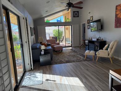 Utilities included except cable. Beautifully furnished 2 master bedroom patio home in a desirable Mesa Arizona golf course neighborhood. Fully upgraded and with beautiful gardens and fruit trees on grounds (think pick fresh grapefruit for your breakfast!) All utilities except cable included. Within 15 minutes to salt river recreation area, hiking, biking, trails. Great restaurants, shopping and entertainment nearby. Pet subject to approval.