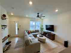 The bright main level features an open-concept layout with a contemporary kitchen, stainless steel appliances, and plenty of natural light. Upstairs, both bedrooms have their own private bathrooms, along with full-size laundry and generous storage throughout.