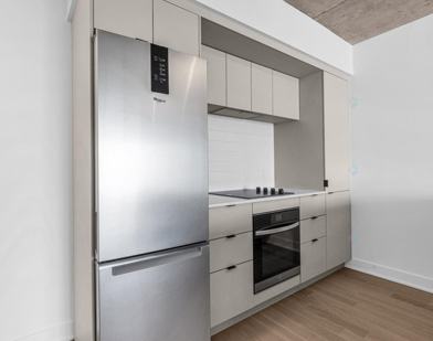The modern kitchen comes with high-quality appliances, while the open living space benefits from excellent natural light and city views. The elegant bathroom with refined finishes completes this functional space. Ideally located in the heart of Ville-Marie, just steps from public transit, cafés, and all amenities.