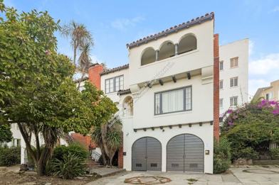 This Spanish Revival 2+story townhouse style unit offers 2 spacious bedrooms, including a large primary bedroom with walk-in closets, and a beautifully upgraded and updated bathroom. The kitchen is a chef's dream with plenty of cabinets, upgraded appliances, a tile backsplash, quartz countertops, and an updated design. The separate living and dining areas feature hardwood floors and a decorative fireplace, adding a touch of old-world charm. The unit also includes in-unit laundry with a washer and dryer in the lower level.