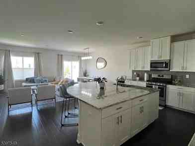 This beautiful move-in ready home is only 5 years old and offers over 2,400 sq. ft. of bright and modern living space. Featuring 9' ceilings on the first and second floors, an open-concept, and hardwood flooring, this home is designed for comfort and style. The upgraded kitchen has a large granite center island, high-end stainless steel appliances, a spacious pantry, recessed lighting, motorized blinds in the living room and master bedroom, and direct access to the deck for backyard grilling. A few steps from the garage lead you right into the main living area. The second floor offers a versatile loft space, a luxurious primary suite with two container store custom made walk-in closets, an office nook, and a spa-like bath with a double vanity and oversized stall shower. Two additional spacious bedrooms, a full guest bath, and a conveniently located laundry room complete this level. The fully finished daylight basement features high ceilings, an egress window, a family room with plush carpeting, a full bath, and ample storage. Additional highlights include a cozy gas fireplace in the living room, recessed lighting throughout, and efficient gas heat and central air. Situated in a prime location, this home is just minutes from major highways, two NJ Transit train stations, and the shopping and dining hubs of Morristown and Morris Plains. Tenant responsible for the first $300 in repairs.