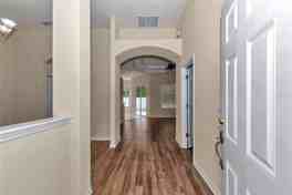 Lovely curb with the perfectly positioned palm tree leading to covered front porch with patio. Step through the glass door into inviting foyer with 2019 luxury vinyl plank flooring. To the left is spacious dining room to the right is the potential fourth bedroom or office. Leading straight ahead through the archway is an oversized living room with tray ceilings overlooking the custom paver and fenced backyard. For the ultimate privacy to the right of the home is a perfectly positioned primary bedroom featuring Tray ceiling and a sitting room. Sitting room as view of the backyard as well. Primary bath is Spa like with double vanity, garden, soaking tub and walk-in tile and glass door surround there are two closets in the primary. Leading back across the home you are greeted with a warm kitchen with 2019 stainless steel appliances, plenty of modern cabinets and a bar top island room for 4 to 5 barstools. There is a breakfast area as well overlooking oversized custom paver patio. Just behind the kitchen are two additional bedrooms and second bathroom perfectly positioned pool potential door leading to the backyard. A 4th bedroom could be easily added. The bathroom features handicap, grab bars and tile combo shower/tub. No carpet in this beautiful home only luxury vinyl plank and tile flooring. Stepping out of your double sliding glass door from the breakfast area you step outside onto a covered lanai perfect for watching the game on the TV!All electrical including outlets and fixtures 2019. 6 months part of maintenance program. Hot water 2023 and the hvac is a 2008 Trane which is best residential system maintained evry This property has fruit trees, oversize paver patio, and 6 foot vinyl fenced with double gate on the right hand side of the property for easy lawnmower, accessibility. There are 42 solar panels on the roof of the home. This home comes equipped with a solar panel system that offers consistent, predictable energy costs—no surprises as utility rates rise. All close to the beach!!!!